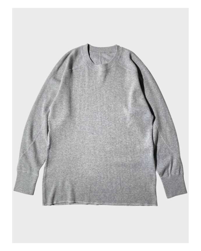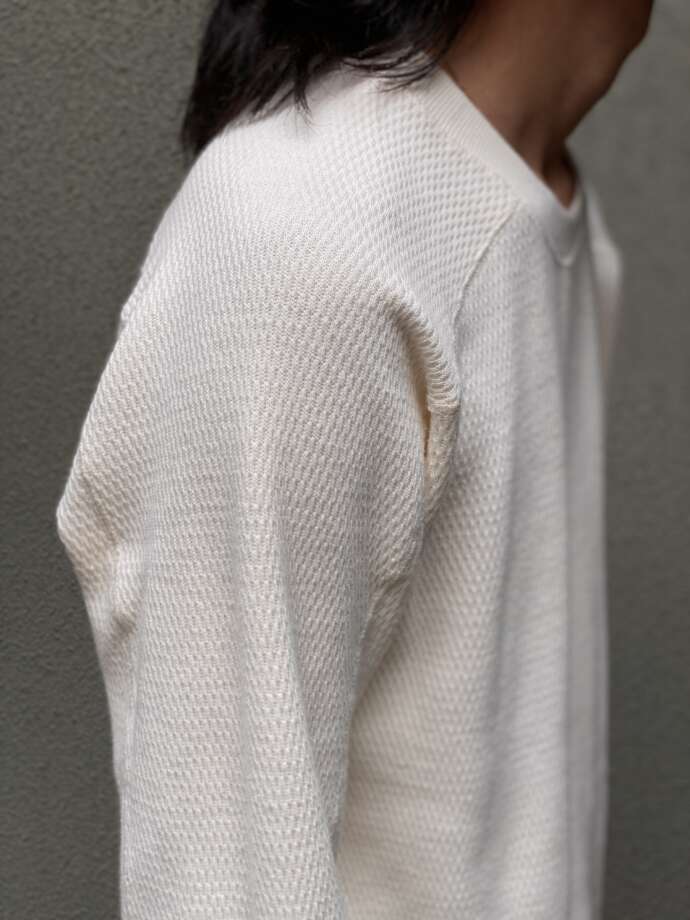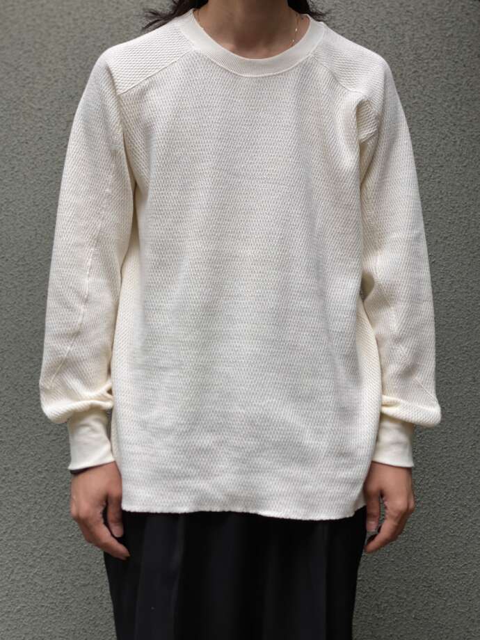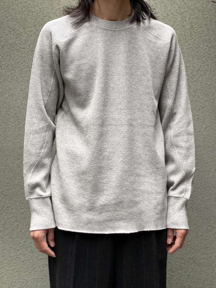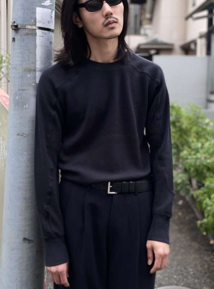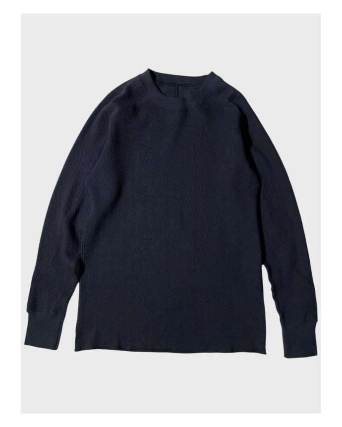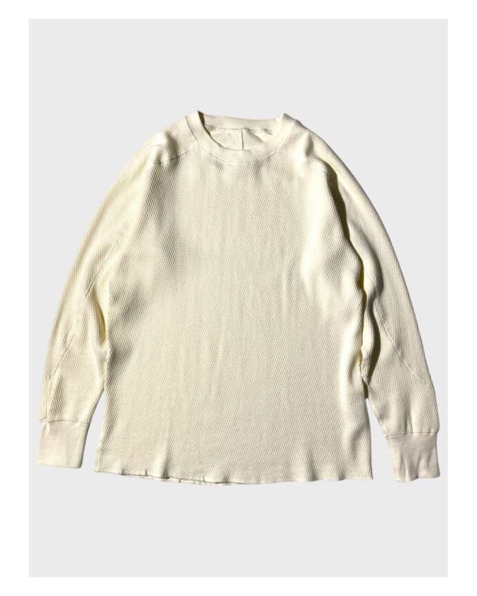 しっかりと肉厚でタフな質感ながら、着心地は驚くほどストレスフリー。古着のサーマルにありがちなピタッとした窮屈さもなく、インナーとしても1枚で着てもサマになります。いわゆる“肌着感”がなく、ロンTのような感覚で着られる万能な一枚です。