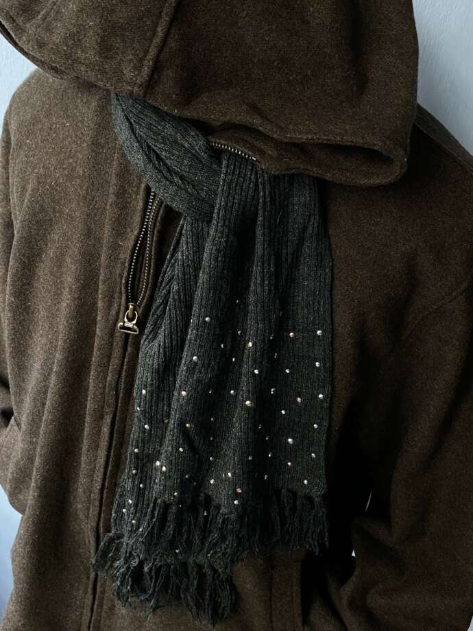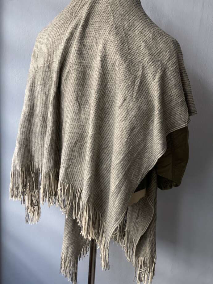 かなりの大判サイズ。ポケット付きのグッドデザイン。垂らしても、巻いても良しです。