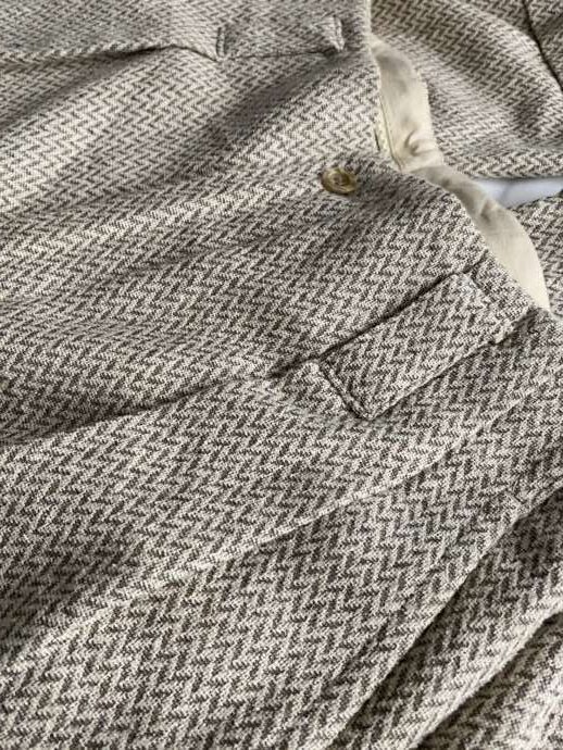 ヘリンボーン柄の転写プリントとビビッドなショッキングピンク面。ポケットの付け方が洒落てます…