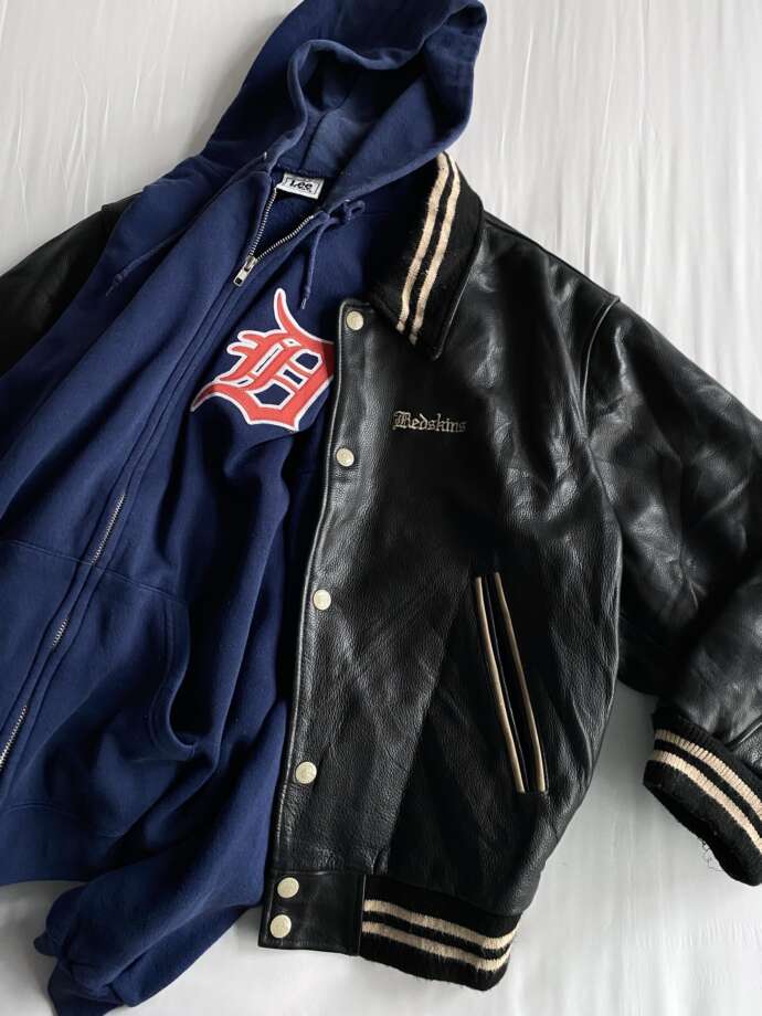 どちらも、オールドイングリッシュの面良さに惹かれてピック。REDSKINSの襟付きスタジャンは肉厚で適度な油分を含んだとても良い革質。着心地 シルエットも良いですし、背中の刺繍も格好良い。オールドイングリッシュ同士が引き寄せた、偶然で必然的であろう組み合わせ。