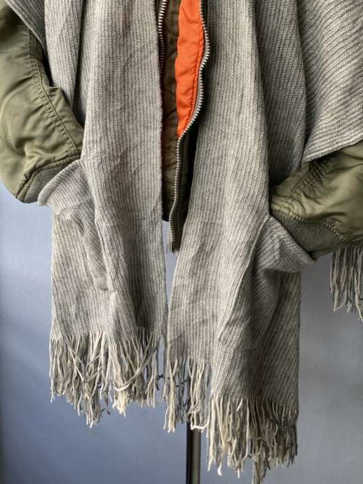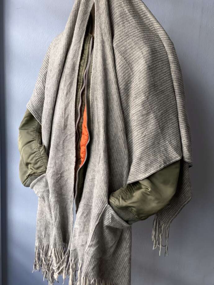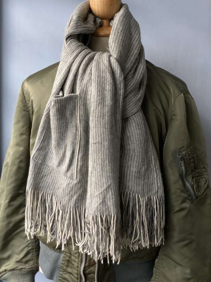 かなりの大判サイズ。ポケット付きのグッドデザイン。垂らしても、巻いても良しです。