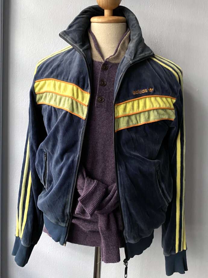 配色が素晴らしい、ベルベットトラックジャケット (曲がりジップ) と100%カシミアニット。