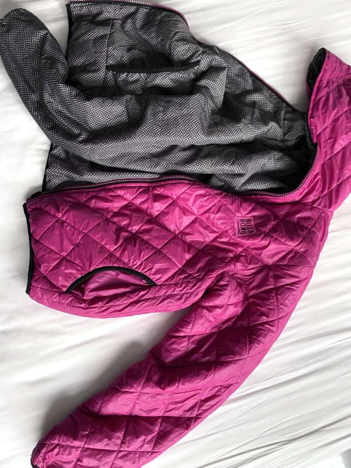 ヘリンボーン柄の転写プリントとビビッドなショッキングピンク面。ポケットの付け方が洒落てます…
