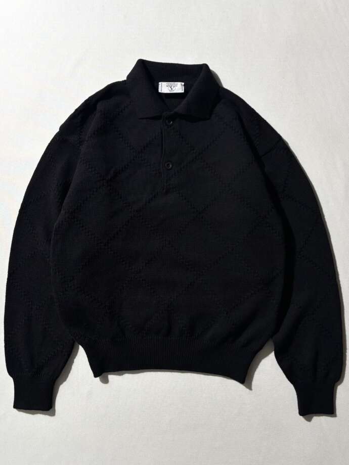 量産のニットではまず見ないですね。プリントや後加工ではなく、異様に綺麗な柄のエッジを編み組織で魅せるニットポロ。