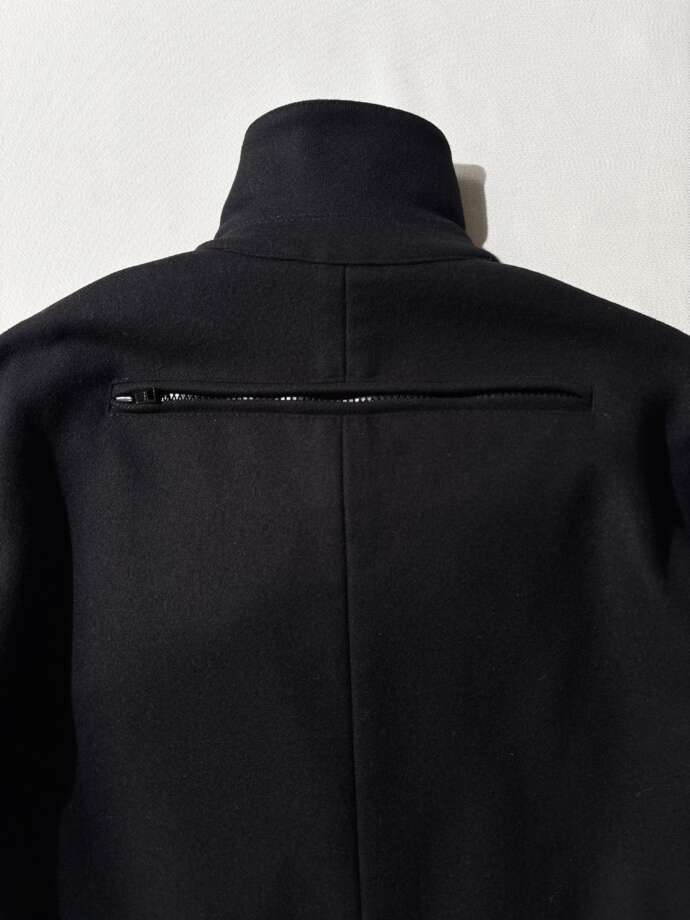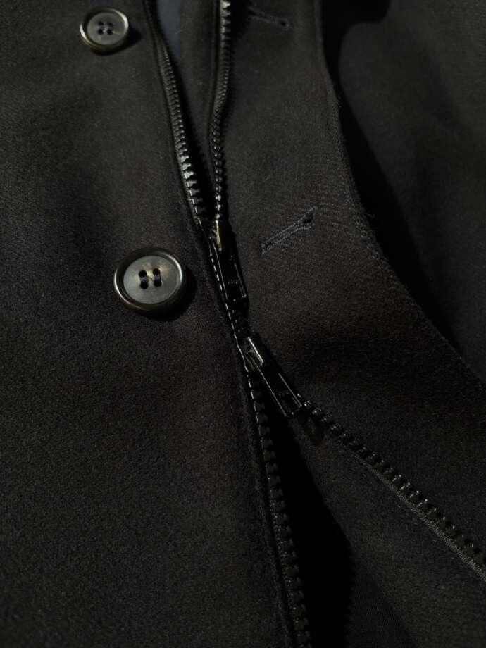 ウールとナイロンの生地に強縮絨と起毛をほどこし、さらにシャーリングの工程を施した特殊素材。仕立てで作り込みすぎず、素材を使った設計。決して量産はできない異常な洋服です。