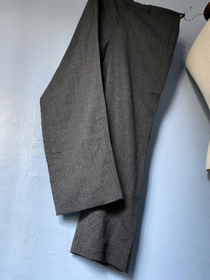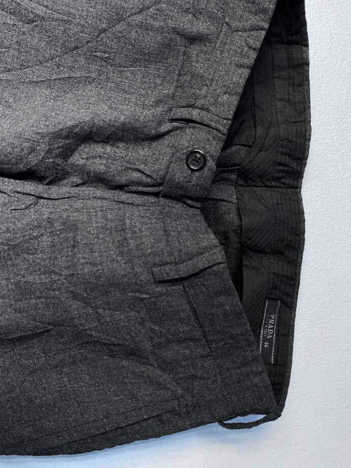 プラダらしい、グレーカラーで上質でとろけるような肌あたりのフラノウール。この年代の表記46個体は細身のイメージですが、こちらはシルエットバランスも申し分ありません。