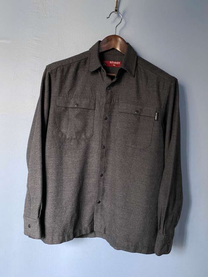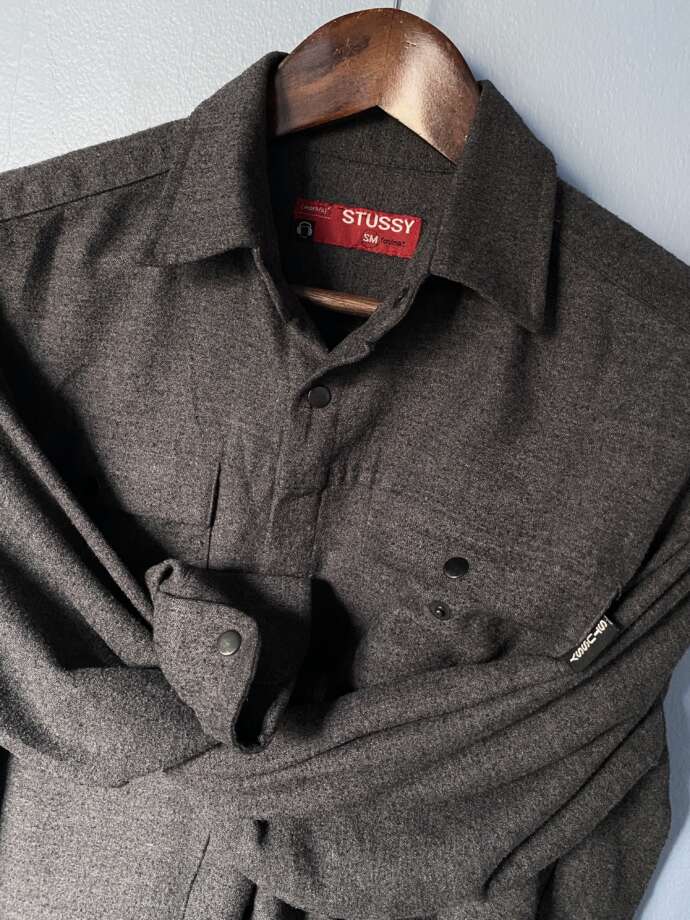 ワークシャツからのリファレンスながらも、土臭さや野暮ったさを感じず、むしろアーバンな空気感を感じるのは、清潔感のあるチャコールカラー選定しかり、フロントのスナップボタン仕様しかり… 00s ステューシーの得意分野。良い塩梅です。